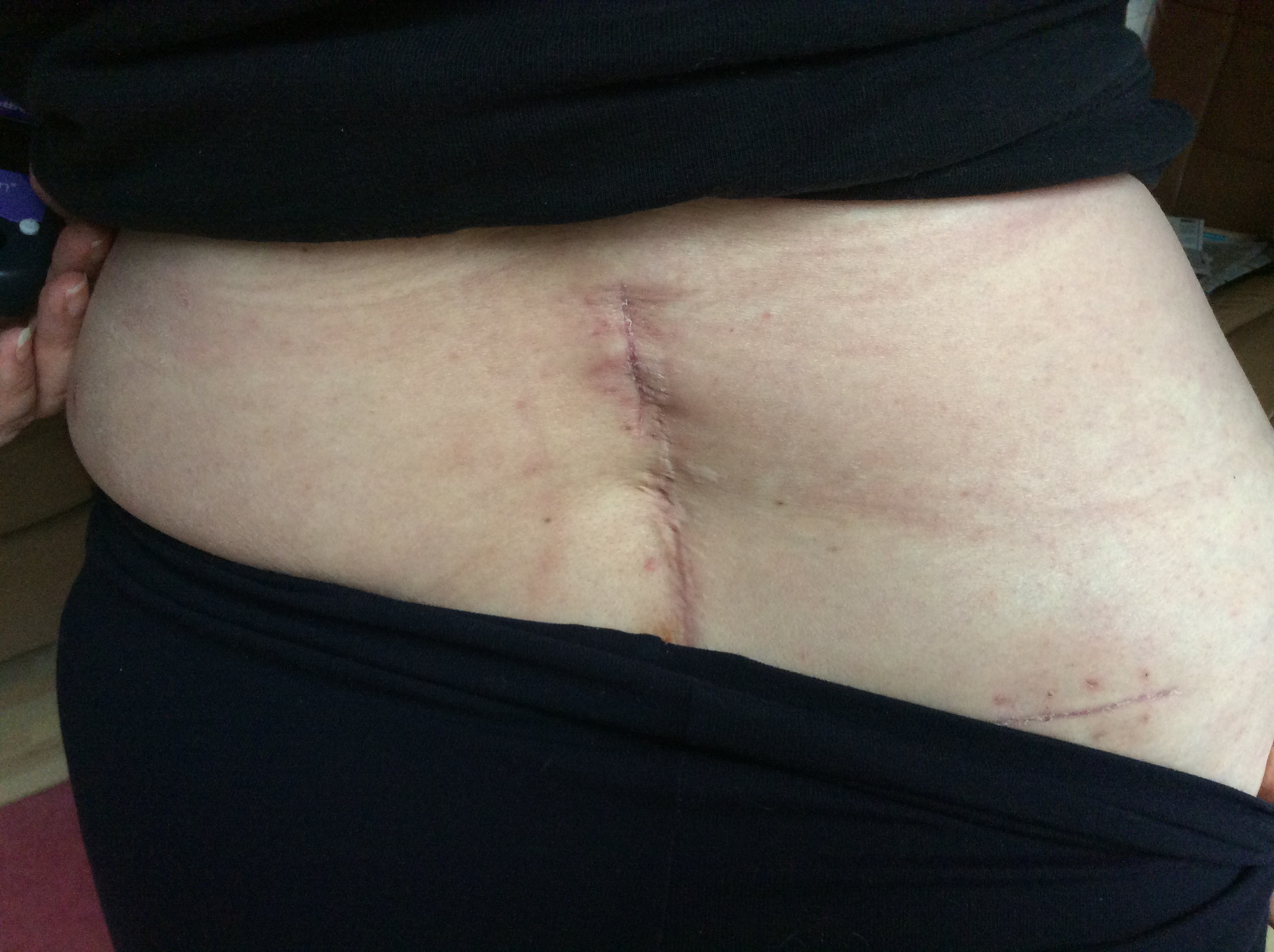 The Stim programmer has to be held directly in contact (above) with the implanted stimulator site (left). The top 2 inches of the long scar is where the electrode leads are implanted – the scar beneath runs down to the natal cleft and is from my previous 3 surgeries. It is keloid, over over granulated – a common problem in Ehlers Danlos due to collagen irregularities.